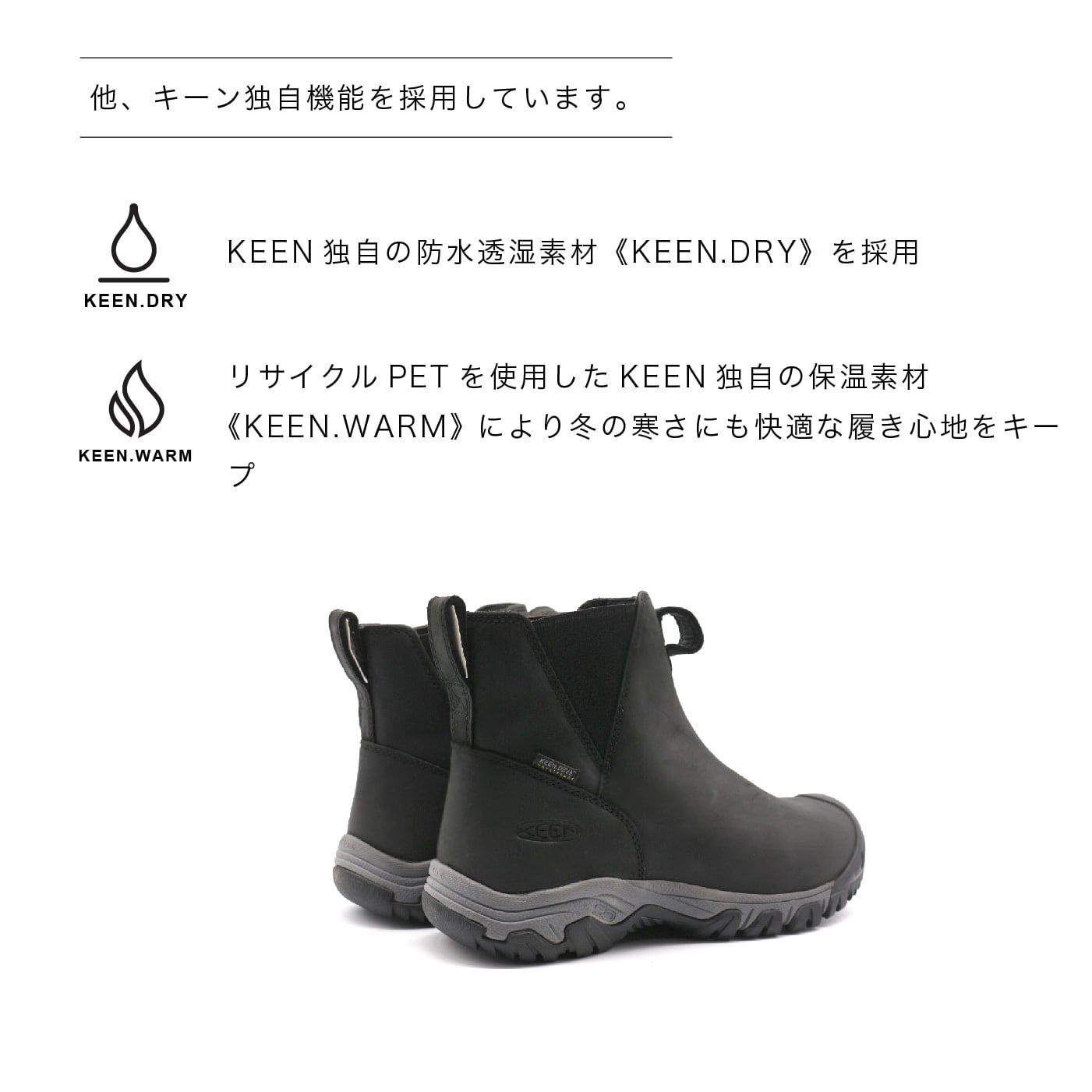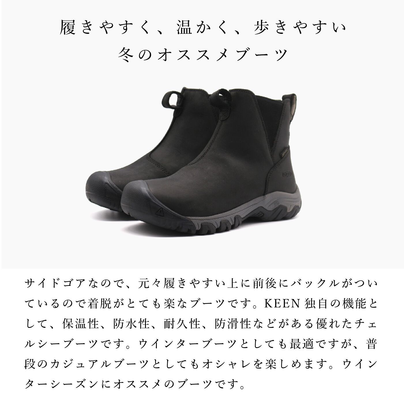 クラシカルなヨーロピアンデザインのアッパーに素材や機能性をしっかり考えてつくられたKEENらしさが詰まったチェルシーブーツです。<br>