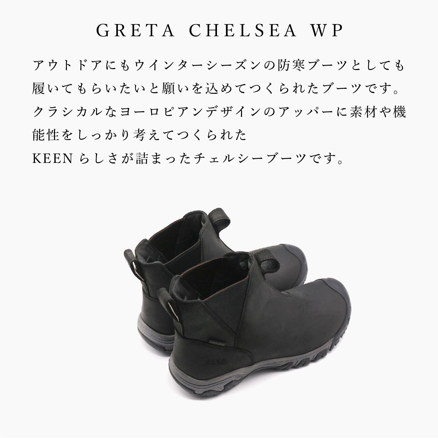 KEEN GRETA CHELSEA WP 1025526 BLACK/STEEL GREYは、洗練されたデザインと優れた機能性を兼ね備えた一足です。アッパー部分には防水加工が施された素材を使用し、悪天候にもしっかり対応。内部は柔らかく、快適な履き心地を実現しています。また、軽量なアウトソールはグリップ力が抜群で、さまざまな地形でも安心して歩くことができます!この一足は、普段使いからちょっとしたお出かけまで、どんなシーンでもスタイリッシュに決まるアイテムとして、ぜひ活用してみてください。